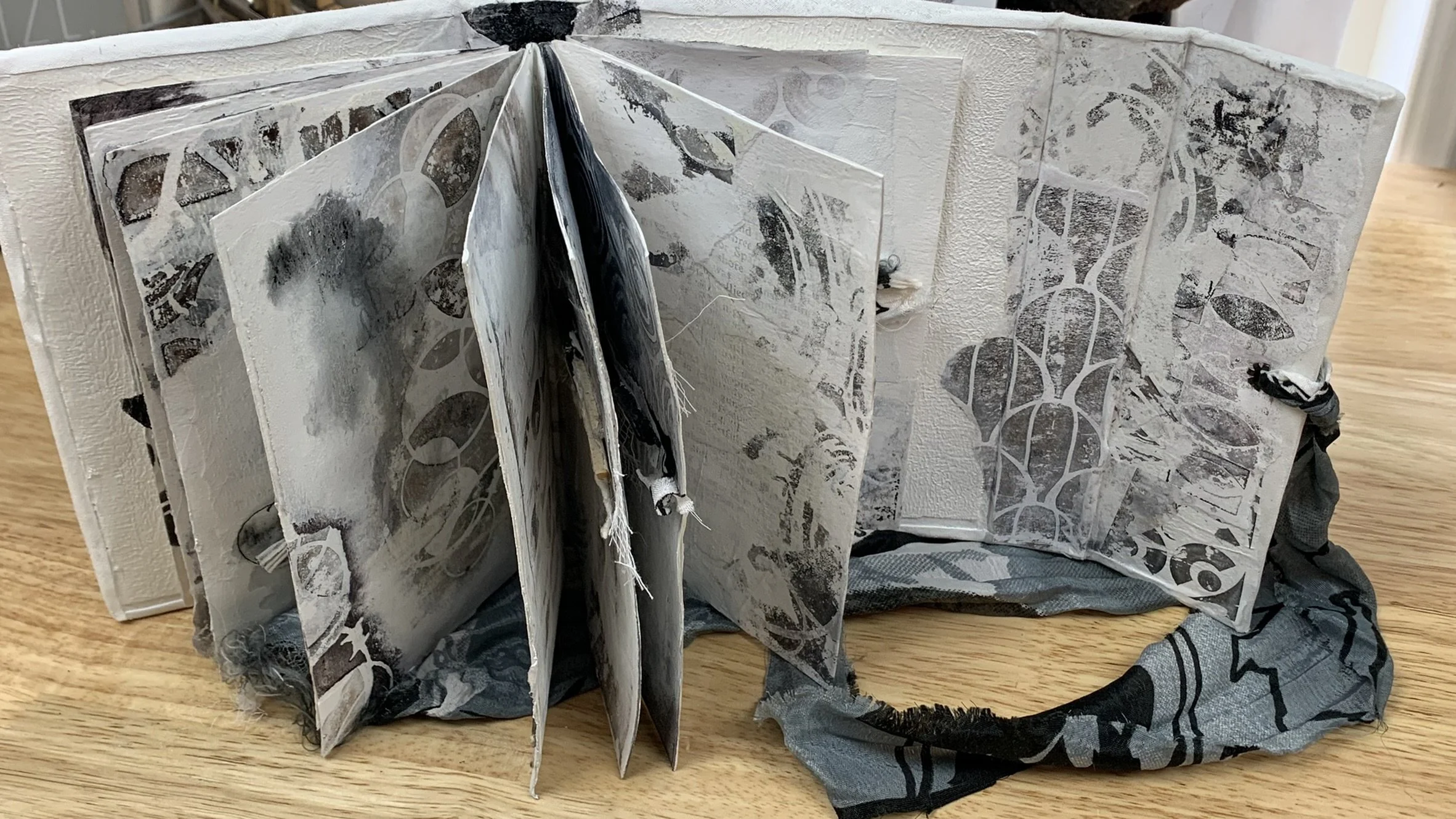 Here is the playlist which starts with the creation of all the papers that went into creating the journal. Using a gel plate, some black and white alcohol inks and a handful of StencilGirl Stencils. The playlist will end with a quick final flip through of the journal, 13 Days as it looks on display at the Southern Arizona Artist Guild Gallery.
