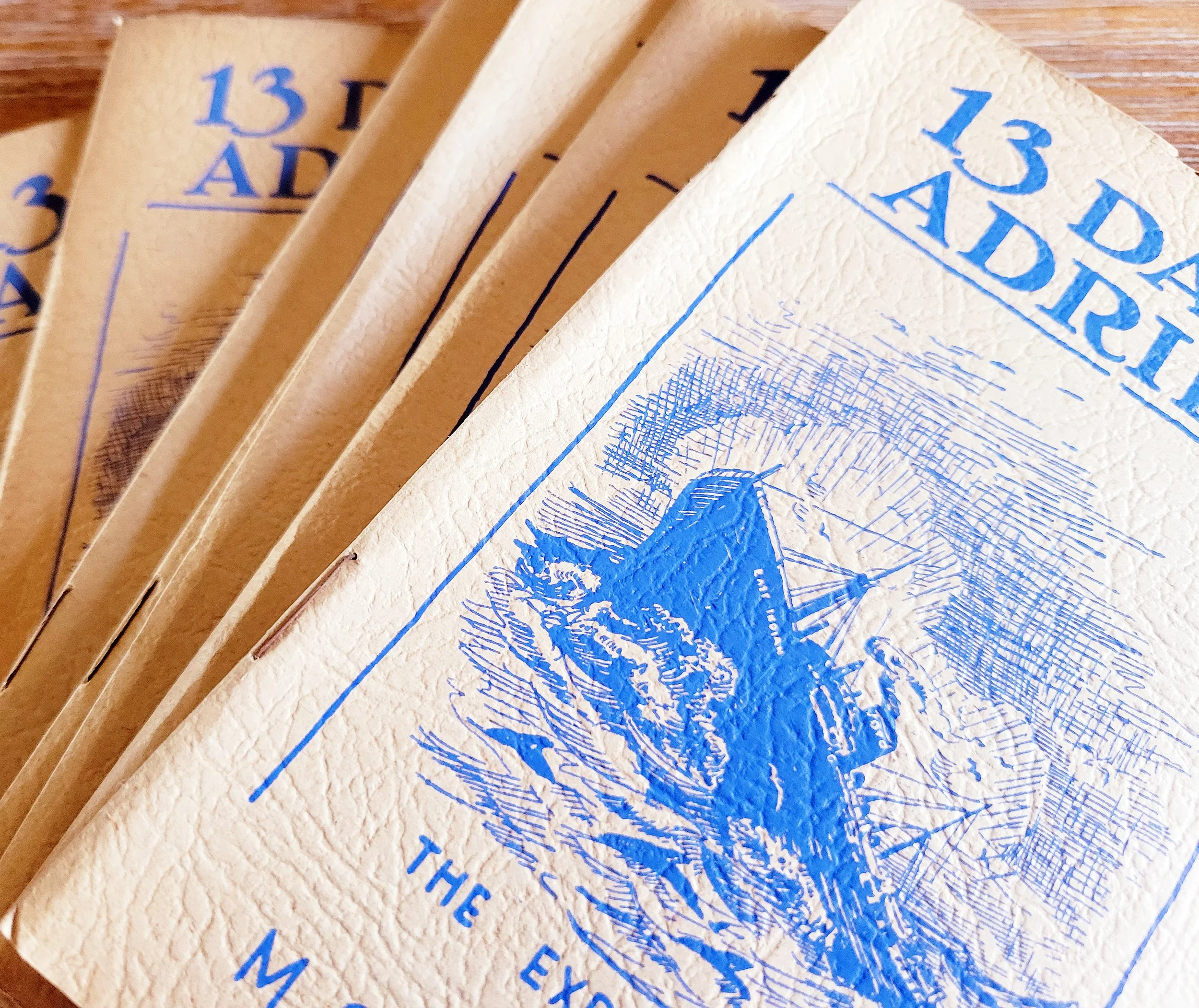 13 Days is an art journal created by me for a StencilGirl Stencils collaboration blog post by Tina Walker. A group of artists were tasked with deconstructing a booklet written by M. Stanley McLean in 1943 titled 13 Days Adrift. Not only did Tina give the collaborators the challenge of working completely in black and white but we were to only use StencilGirl Stencils and select a “theme” shape to run through the entire journal. The original booklet would also prove to be a challenge to work with.